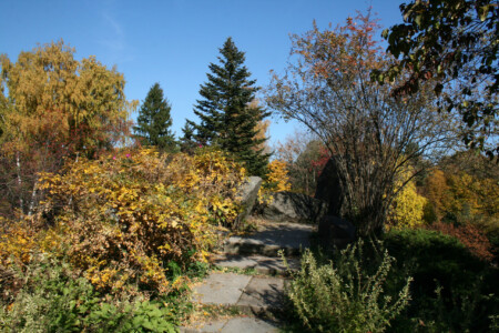 Кавказская горка – самая высокая в альпинарии, на высочайшей ее точке находится небольшая смотровая площадка, откуда открывается вид на водоем и большинство других горок.